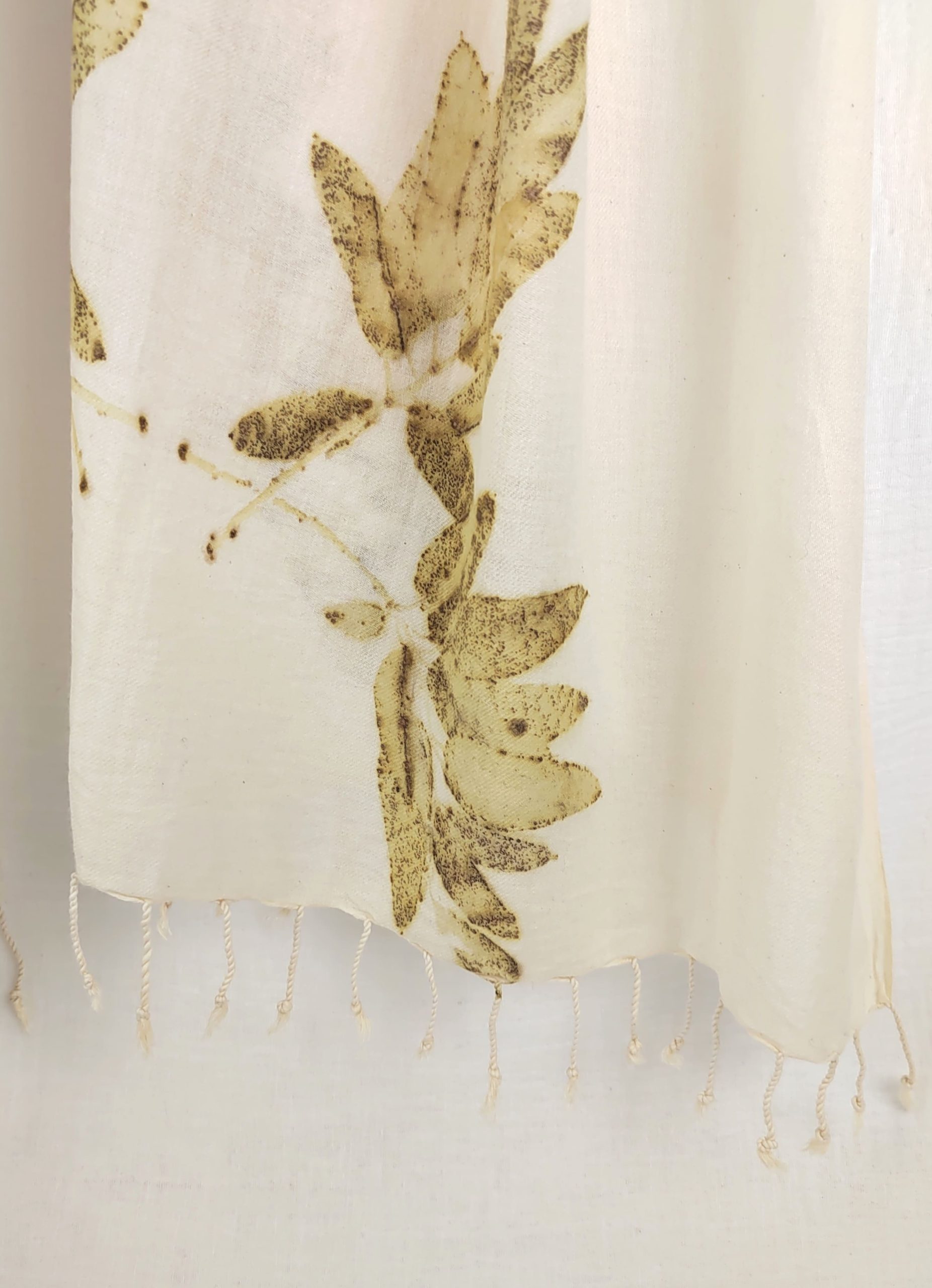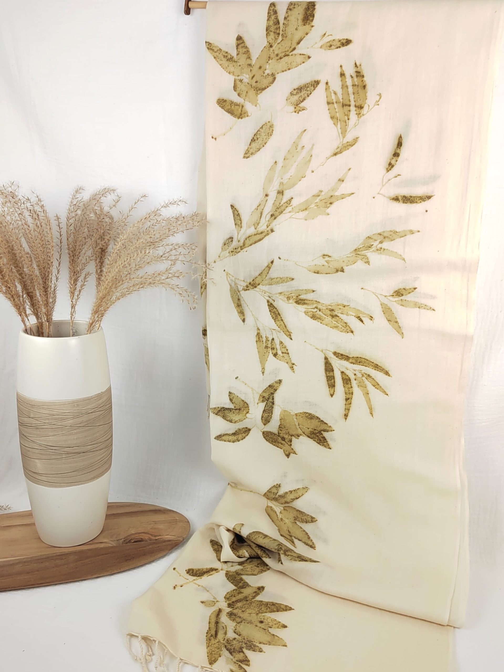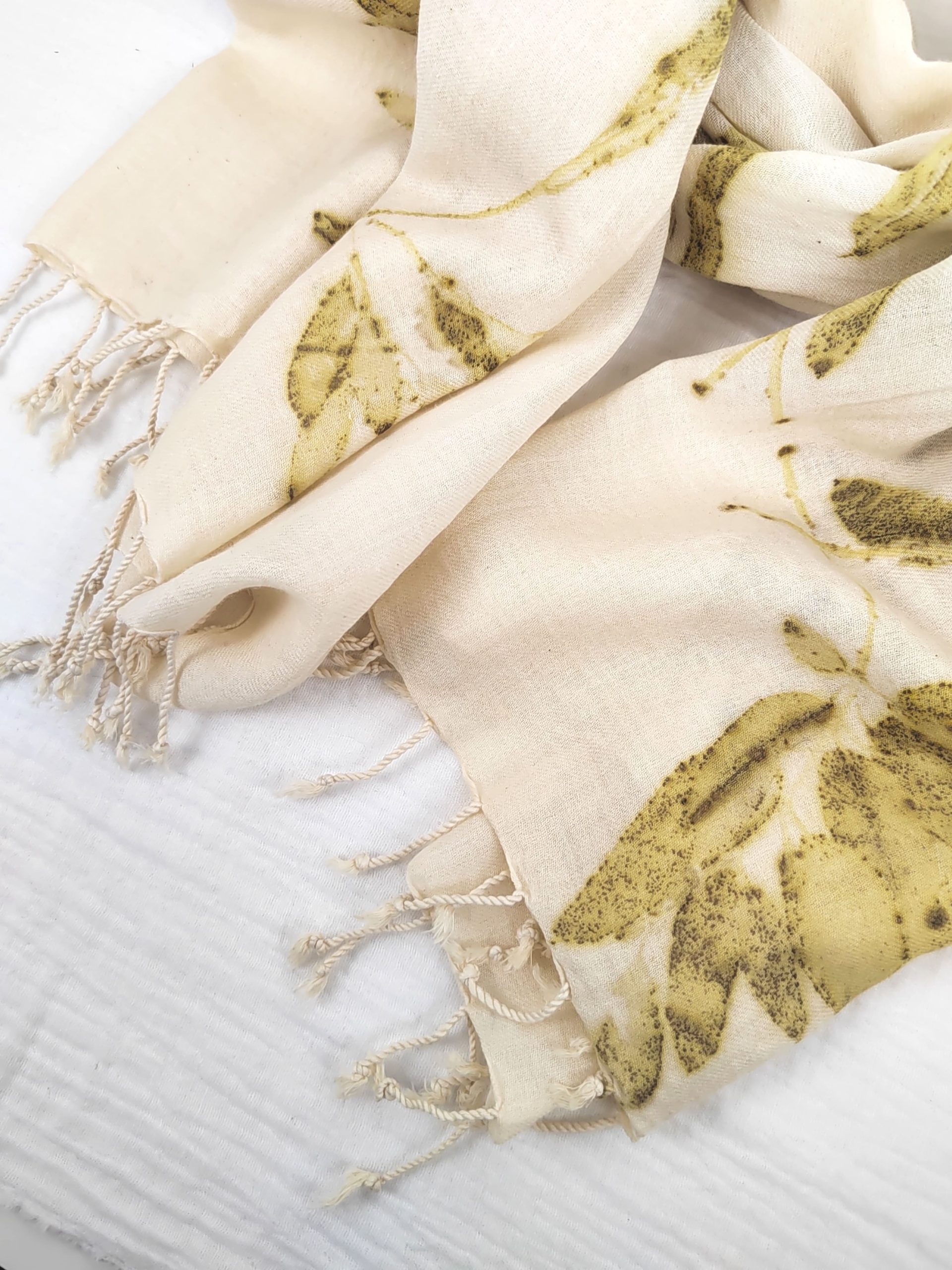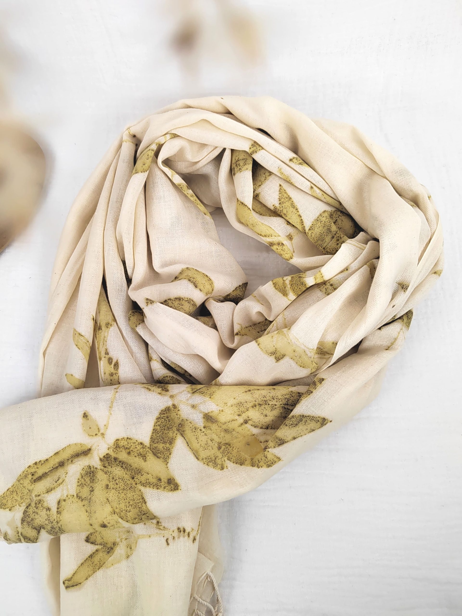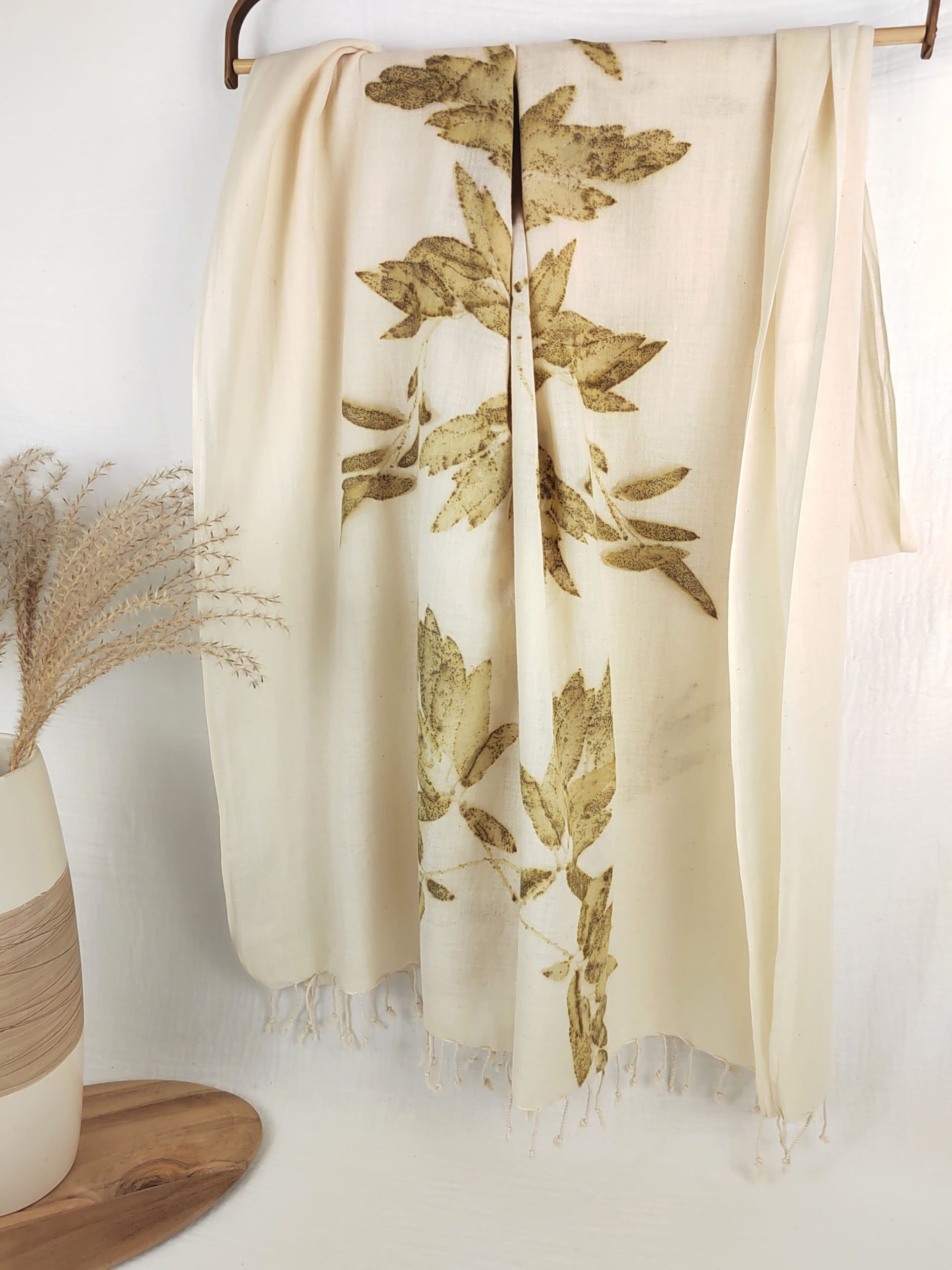 Un grand foulard en coton bio tout doux orné de délicates empreintes végétales pour vous entourer de nature au quotidien.