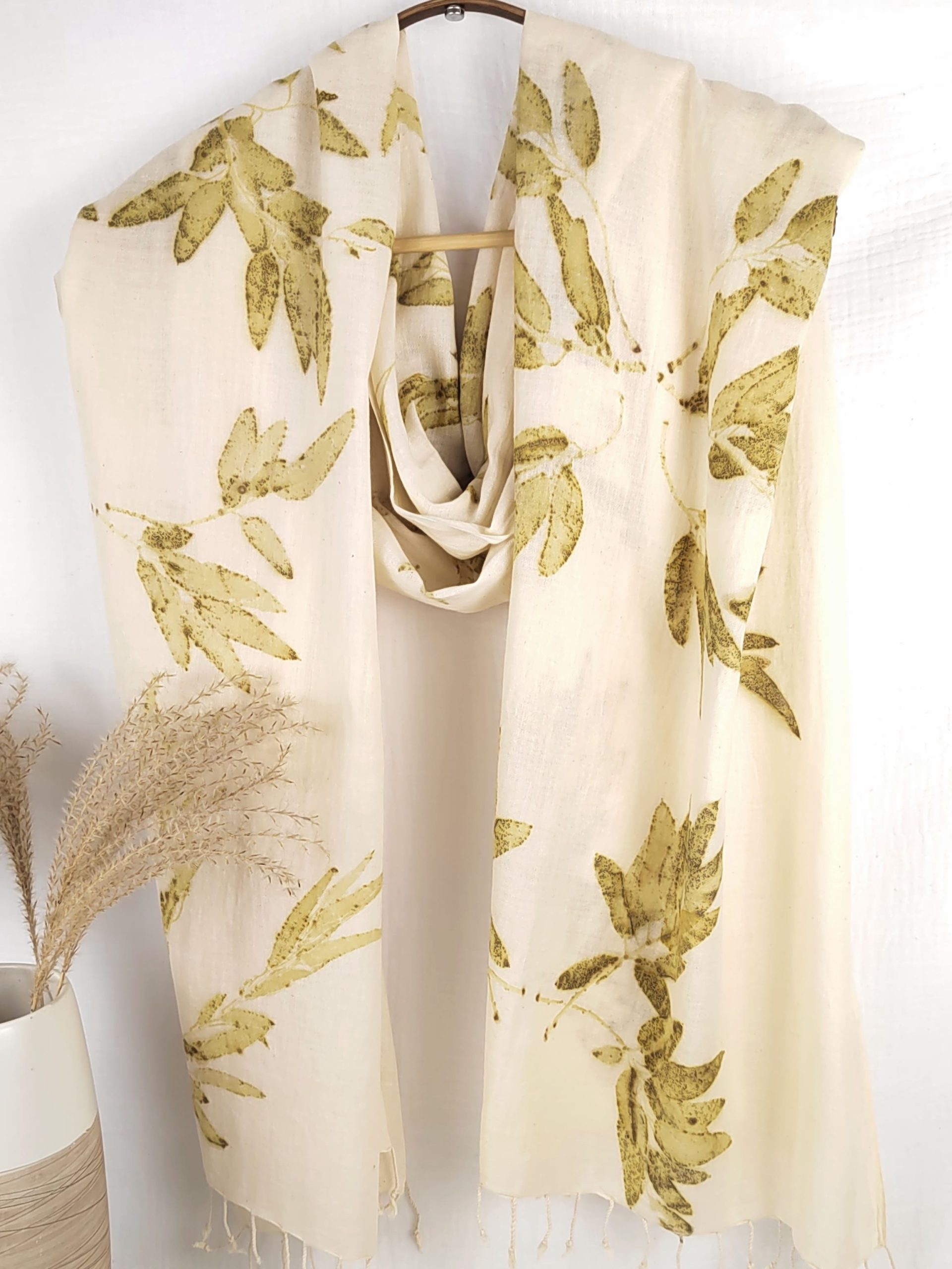 Découvrez la douceur de ce grand foulard en coton bio orné de délicates empreintes de feuilles.