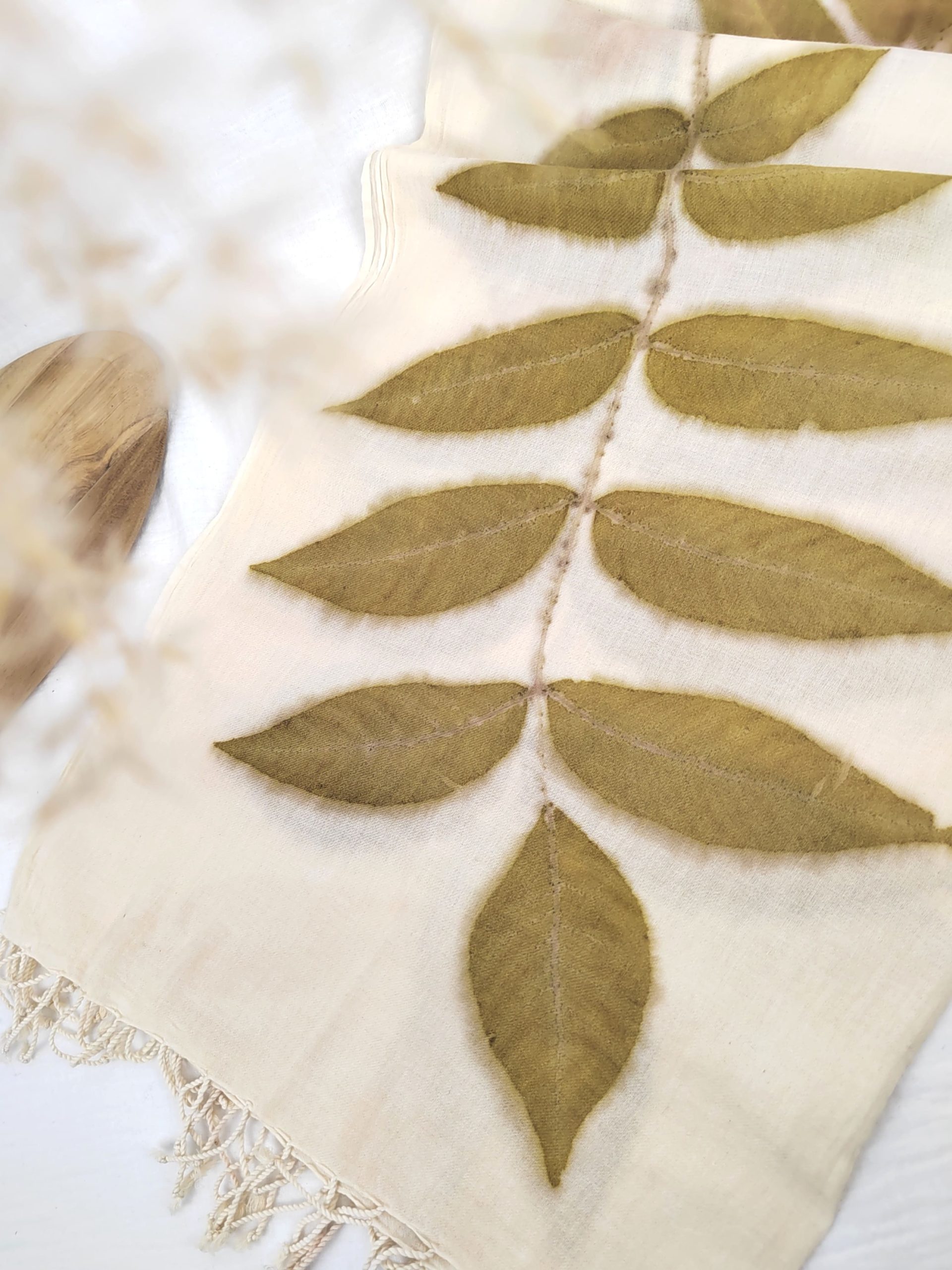 Empreintes végétales réalisées à la main dans mon atelier Francilien à l'aide de plantes tinctoriales récoltées ou glanées localement.